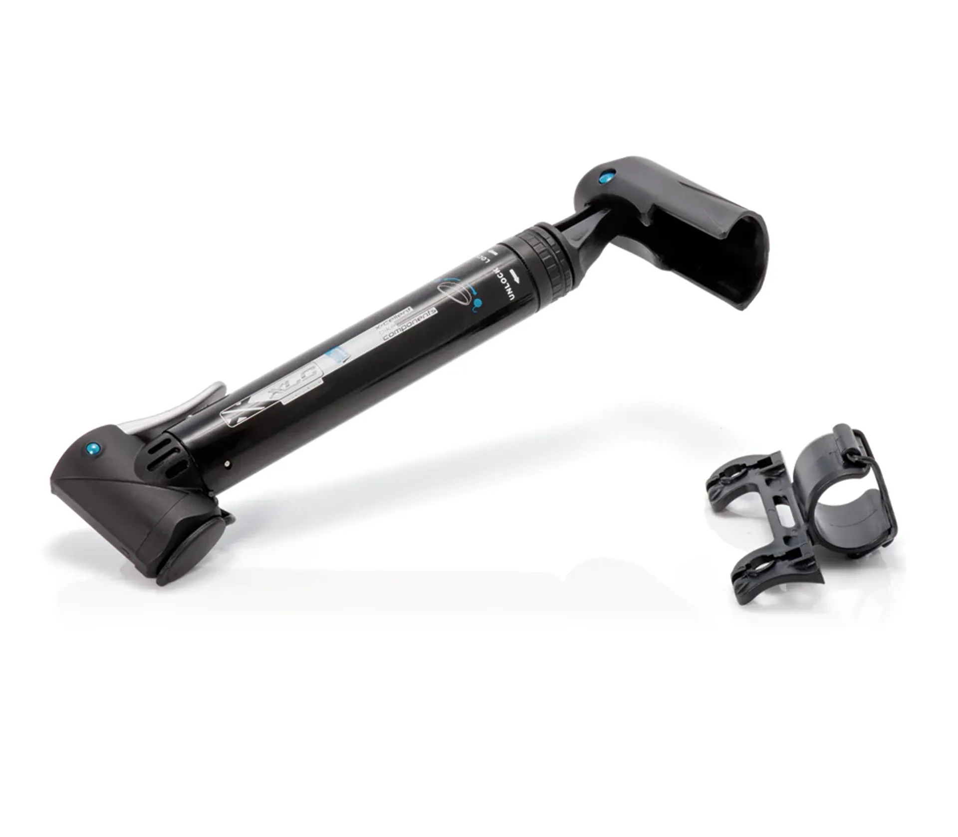 The XLC mini pump alpha PU-M01 has a dual pump head which is compatible with any type of valve. It comes with a universal mount and an elastic strap so it can be attached to any bicycle.